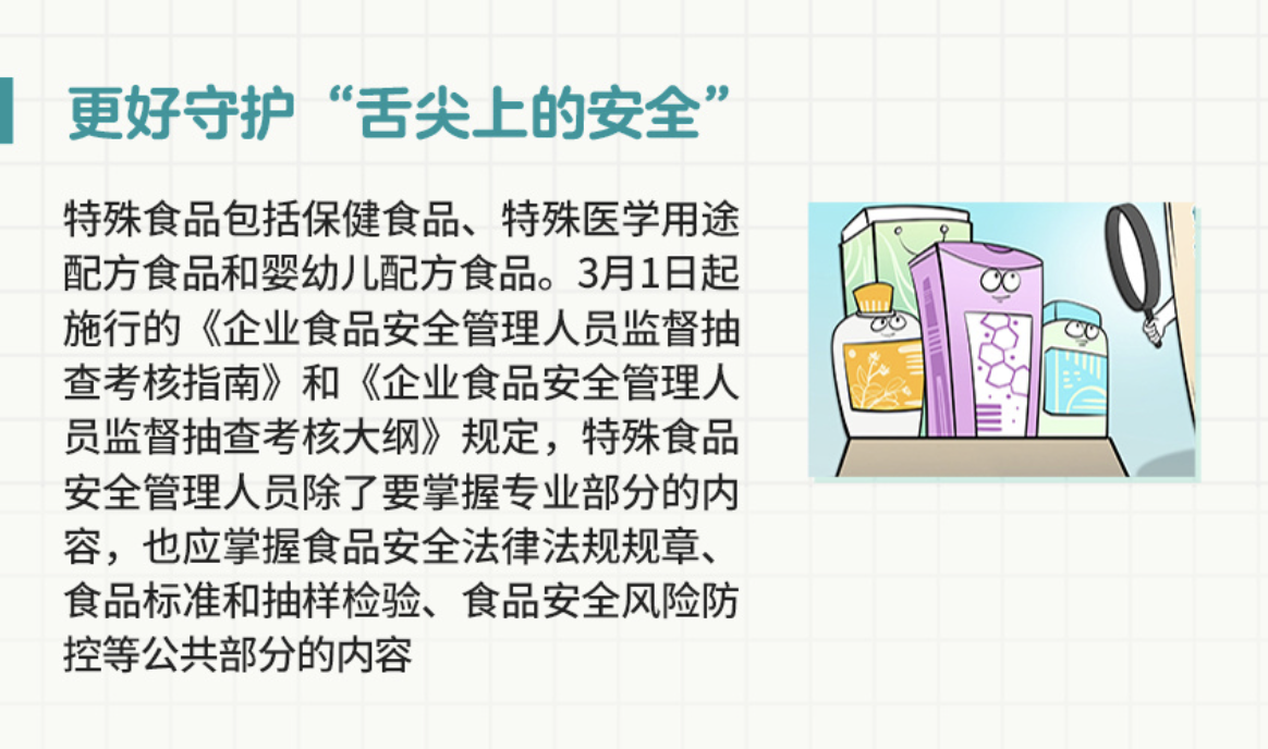 3月1日起施行的《企業(yè)食品安全管理人員監(jiān)督抽查考核指南》和《企業(yè)食品安全管理人員監(jiān)督抽查考核大綱》規(guī)定,特殊食品(注:特殊食品包括保健食品、特殊醫(yī)學用途配方食品和嬰幼兒配方食品)安全管理人員除了要掌握專業(yè)部分的內(nèi)容,也應(yīng)掌握食品安全法律法規(guī)規(guī)章、食品標準和抽樣檢驗、食品安全風險防控等公共部分的內(nèi)容。