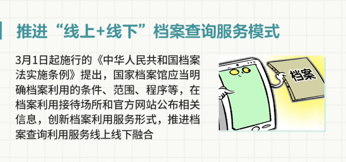 3月1日起施行的《中華人民共和國檔案法實施條例》提出,國家檔案館應(yīng)當明確檔案利用的條件、范圍、程序等,在檔案利用接待場所和官方網(wǎng)站公布相關(guān)信息,創(chuàng)新檔案利用服務(wù)形式,推進檔案查詢利用服務(wù)線上線下融合。