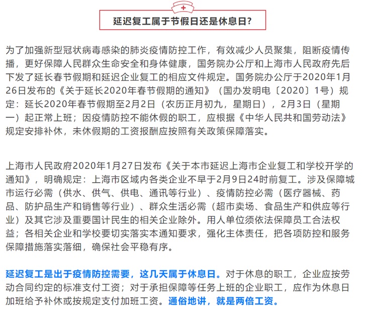 日前,國務(wù)院辦公廳于2020年1月26日發(fā)布的《關(guān)于延長2020年春節(jié)假期的通知》(國辦發(fā)明電〔2020〕1號)規(guī)定:延長2020年春節(jié)假期至2月2日(農(nóng)歷正月初九,星期日),2月3日(星期一)起正常上班;因疫情防控不能休假的職工,應(yīng)根據(jù)《中華人民共和國勞動法》規(guī)定安排補(bǔ)休,未休假期的工資報酬應(yīng)按照有關(guān)政策保障落實(shí)。