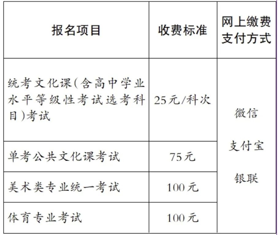 不同報(bào)名項(xiàng)目費(fèi)用有所不同,其中統(tǒng)考文化課(含高中學(xué)業(yè)水平等級性考試選考科目)考試為每科次25元,單考公共文化課考試報(bào)名費(fèi)為75元,美術(shù)類專業(yè)統(tǒng)一考試和體育專業(yè)考試兩項(xiàng)目報(bào)名費(fèi)各為100元。