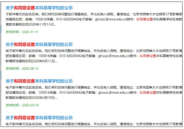 公示指出,根據(jù)《高等教育法》《普通高等學(xué)校設(shè)置暫行條例》《普通本科學(xué)校設(shè)置暫行規(guī)定》和《關(guān)于加快推進(jìn)獨(dú)立學(xué)院轉(zhuǎn)設(shè)工作的實(shí)施方案》等法律法規(guī)政策規(guī)定,經(jīng)第七屆全國高等學(xué)校設(shè)置評議委員會專家考察和評議,并經(jīng)黨組會審議,擬同意重慶工商大學(xué)融智學(xué)院等21所獨(dú)立學(xué)院轉(zhuǎn)設(shè)為獨(dú)立設(shè)置的本科學(xué)校,現(xiàn)將學(xué)校名單等信息向社會公示。公示時間為2020年11月11日至11月25日。