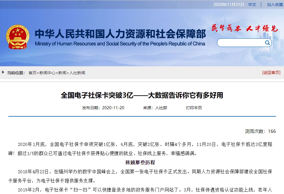 2020-11-21 17:28:10閱讀()人社部11月21日消息 根據(jù)人社部的消息,截至 11 月 20 日,電子社保卡抵達(dá) 3 億里程碑,超過 1/5 的群眾已可通過電子社保卡獲得貼心便捷的就業(yè)、社保線上服務(wù)。
