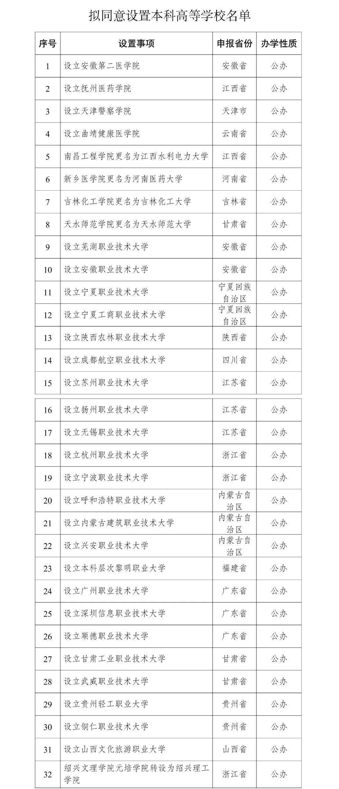 根據(jù)《中華人民共和國高等教育法》《普通高等學(xué)校設(shè)置暫行條例》《普通本科學(xué)校設(shè)置暫行規(guī)定》《本科層次職業(yè)學(xué)校設(shè)置標(biāo)準(zhǔn)(試行)》等有關(guān)規(guī)定以及第八屆全國高等學(xué)校設(shè)置評議委員會考察評議結(jié)果,經(jīng)教育部黨組會議審議,擬同意設(shè)置安徽第二醫(yī)學(xué)院等32所學(xué)校,現(xiàn)予公示。