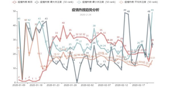 為了更好的從網(wǎng)絡(luò)中觀察這次疫情,文摘菌爬取從1月1日至2月21日每天12:00微博熱搜榜前50的條目,一共得到2600條熱搜數(shù)據(jù),我們對(duì)這些數(shù)據(jù)用python進(jìn)行了處理和分析,得出了很多有意思的信息: