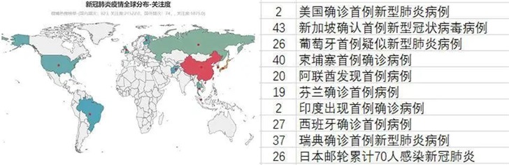 以關(guān)注度最高的日本為例,前期因?yàn)橄蛑袊?guó)捐贈(zèng)10萬(wàn)套防護(hù)服和其他物資而上熱搜,后期則因?yàn)?ldquo;鉆石公主”號(hào)郵輪出現(xiàn)聚集性感染而受到廣泛關(guān)注。