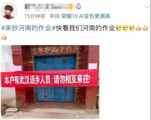 河南的首次上熱搜是因?yàn)?ldquo;硬核”的防疫“作業(yè)”讓其他省份的網(wǎng)友羨慕不已,1月24日“河南硬核”的條目進(jìn)入微博熱搜前五,同一天,“來(lái)抄河南作業(yè)”的熱搜從第17位躍升至第9位。