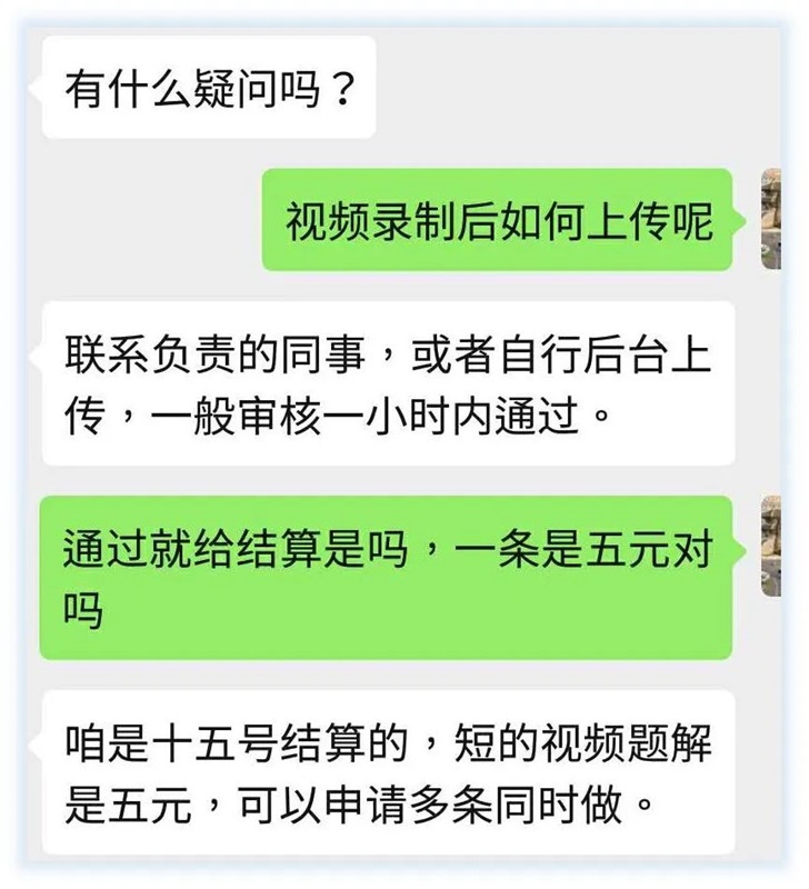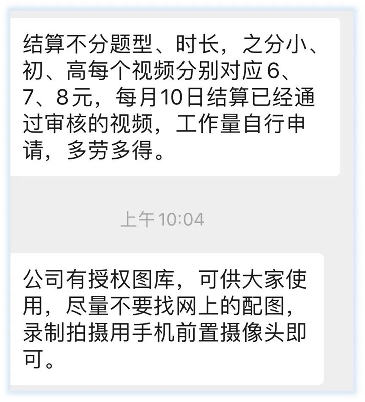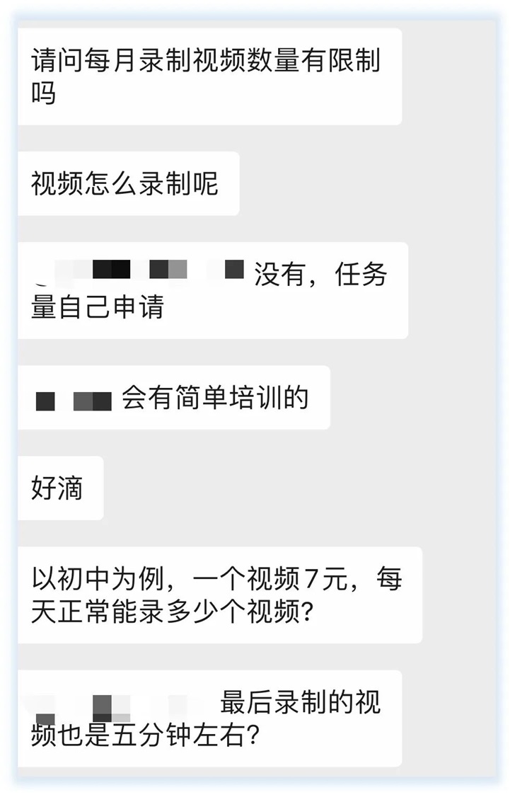 另一家位于寧波的在線教育機構(gòu)更是開出了超低的薪酬,“大家可以多錄些視頻,如果通過的話,文科短視頻每條5元,理科短視頻是6元。”群里一位負責統(tǒng)籌的工作人員如是說。