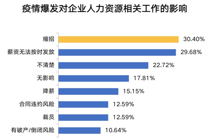 根據(jù)智聯(lián)招聘的調(diào)查,30.4% 的企業(yè)表示將會(huì)減員縮編,還有 29.68% 無法為員工按時(shí)發(fā)放薪資,無影響的企業(yè)僅占 17.81% 。另外,慘淡經(jīng)營(yíng)下,降薪、合同違約風(fēng)險(xiǎn)、裁員也成為企業(yè)不得不面對(duì)的問題,10.64% 的受訪企業(yè)面臨著破產(chǎn)或倒閉的風(fēng)險(xiǎn)。