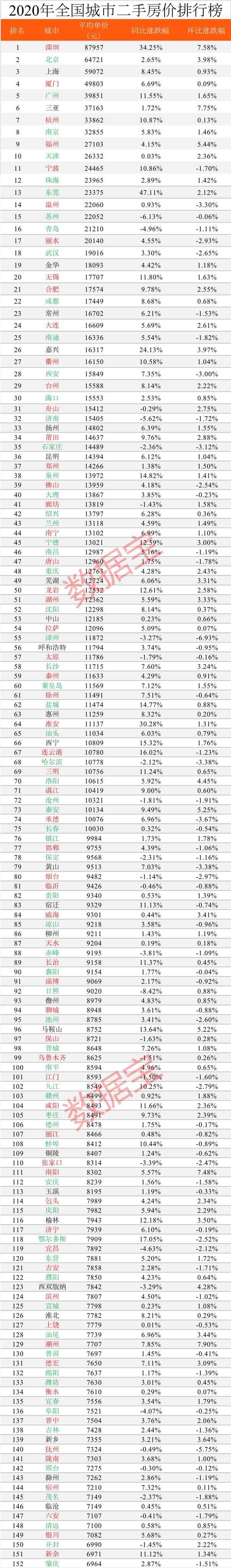 有著樓市茅臺之稱的深圳樓市,二手房價也出現(xiàn)大漲。證券時報·數(shù)據(jù)寶追蹤的《2020年316個城市房價排行榜》數(shù)據(jù)顯示,深圳房價強者恒強,2020年12月底二手房均價同比上漲超34%,站穩(wěn)8萬元大關,蟬聯(lián)全國榜首的同時再創(chuàng)歷史新高,均價比北京貴23236元,比上海高近50%,2.2倍于廣州2.6倍于杭州。