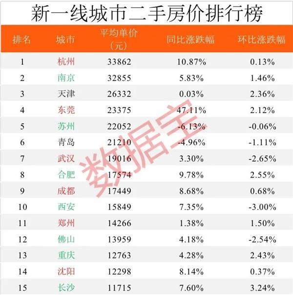 新一線二手房價排行榜中,東莞二手房均價排名大幅飆升5位,從2019年底的第九位飆升至2020年底的第四位。蘇州、青島、武漢三個城市退居1位,西安、鄭州、佛山等5城市排名不變,長沙依舊位居倒數(shù)第一。