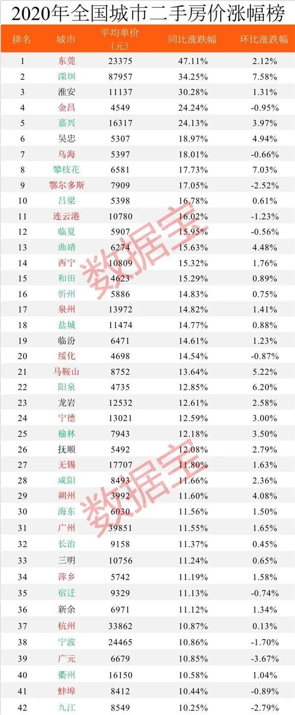 數(shù)據(jù)寶追蹤的2020年全國房價漲幅榜數(shù)據(jù)顯示,東莞二手房均價達到23375元,同比上漲47.11%,高居全國第一。深圳房價同比上漲34.25%,高居全國第二。四大一線城市房價全部上漲,廣州漲11.55%,上海漲8.45%,北京漲2.65%。新一線城市中,杭州漲幅超過10%。其他房價漲幅較大的大城市還有西寧、無錫、寧波等城市。
