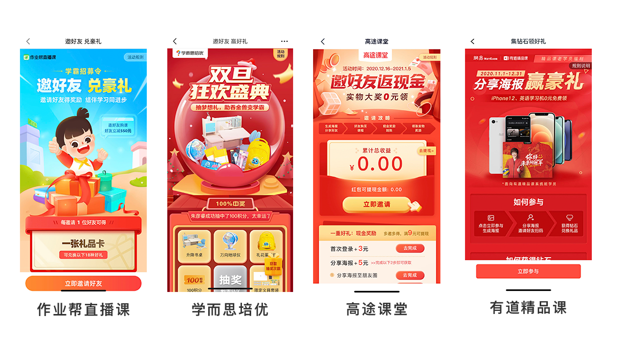 根據(jù)不同的形式底層邏輯無非是這幾類,隨著在線教育的興起,目前各家主流業(yè)務(wù)都在拉新上,打法多樣、高速響應(yīng),這也是近幾年我們越來越多看到教育類品牌的滲透到日常生活中原因。