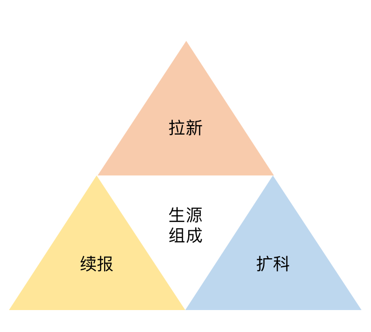 對于非初創(chuàng)教育機(jī)構(gòu)來說,生源主要從三方面組成:續(xù)報、擴(kuò)科、拉新。