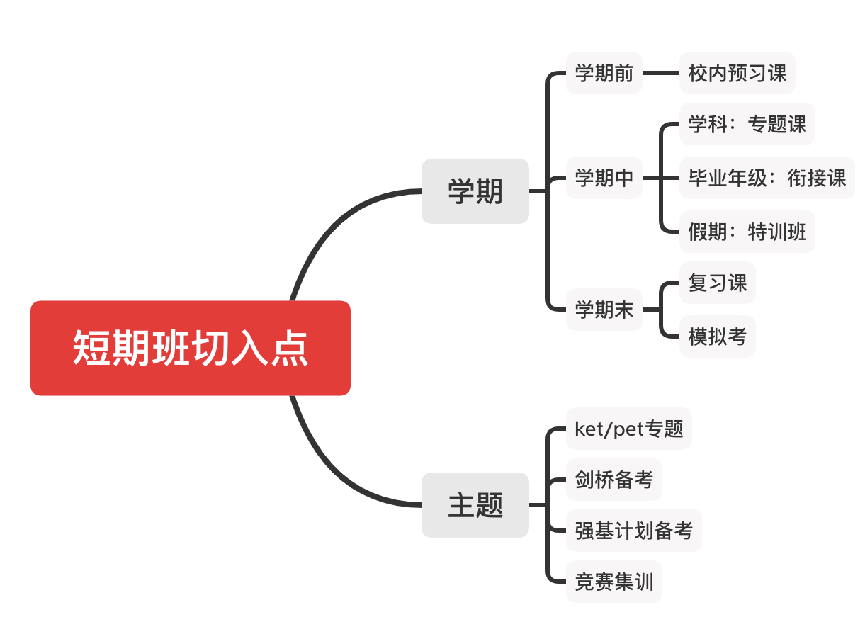 短期班是以「試聽課」為出發(fā)點,感受老師(教學(xué)風(fēng)格、實力等)、產(chǎn)品(課程質(zhì)量、使用實用工具等)、服務(wù)(答疑、資料等)等多個方面?;谥饕闹R點包裝個短期班,也會根據(jù)時期匹配試點課的內(nèi)容,比如劍橋備考,給一個觸手去接觸到用戶。