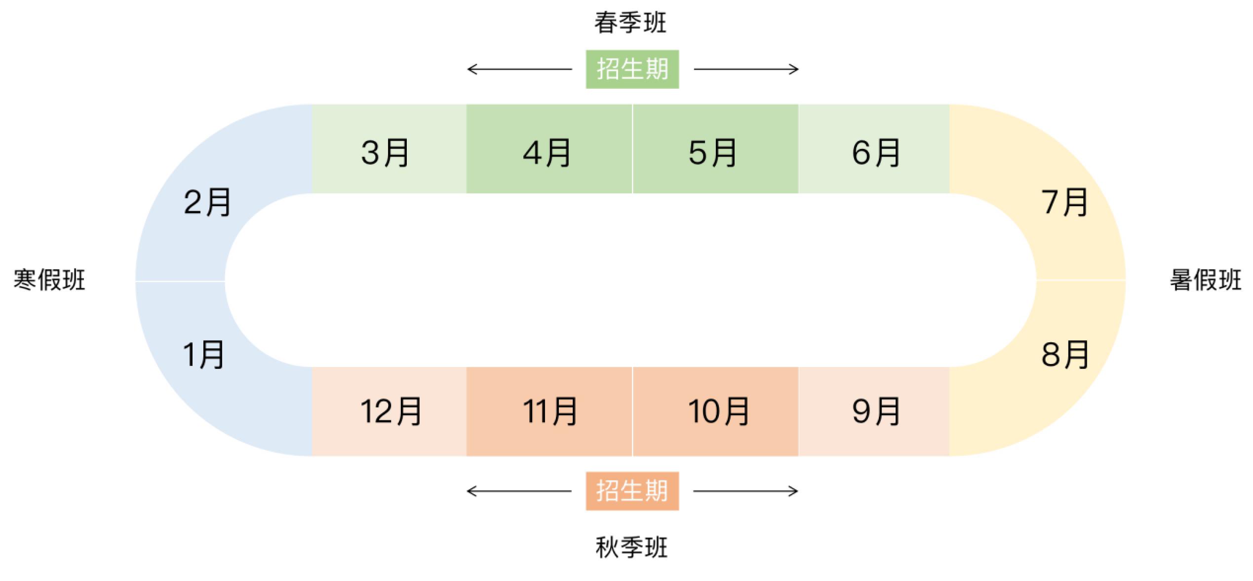 目前國內(nèi)的k12教育課外培訓(xùn)以補(bǔ)充課內(nèi)和提升為主,所以在課程時間安排、課程內(nèi)容的設(shè)置都與公立校有緊密的聯(lián)系。在春/秋季班只能都得在課余時間參加培訓(xùn),所以3-6月和9-12月的課程基本在工作日的晚上和周末開展。而暑/寒假班是校內(nèi)放假階段,所以7-8月和1-2月則可以全天參與培訓(xùn)。