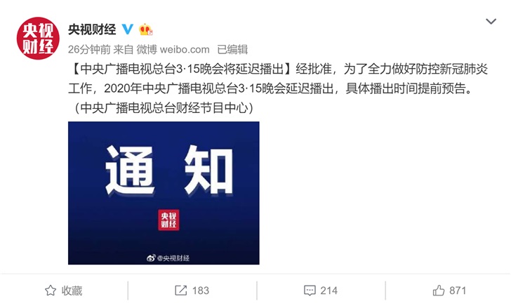 經批準,為了全力做好防控新冠肺炎工作,2020年中央廣播電視總臺3·15晚會延遲播出,具體播出時間提前預告。