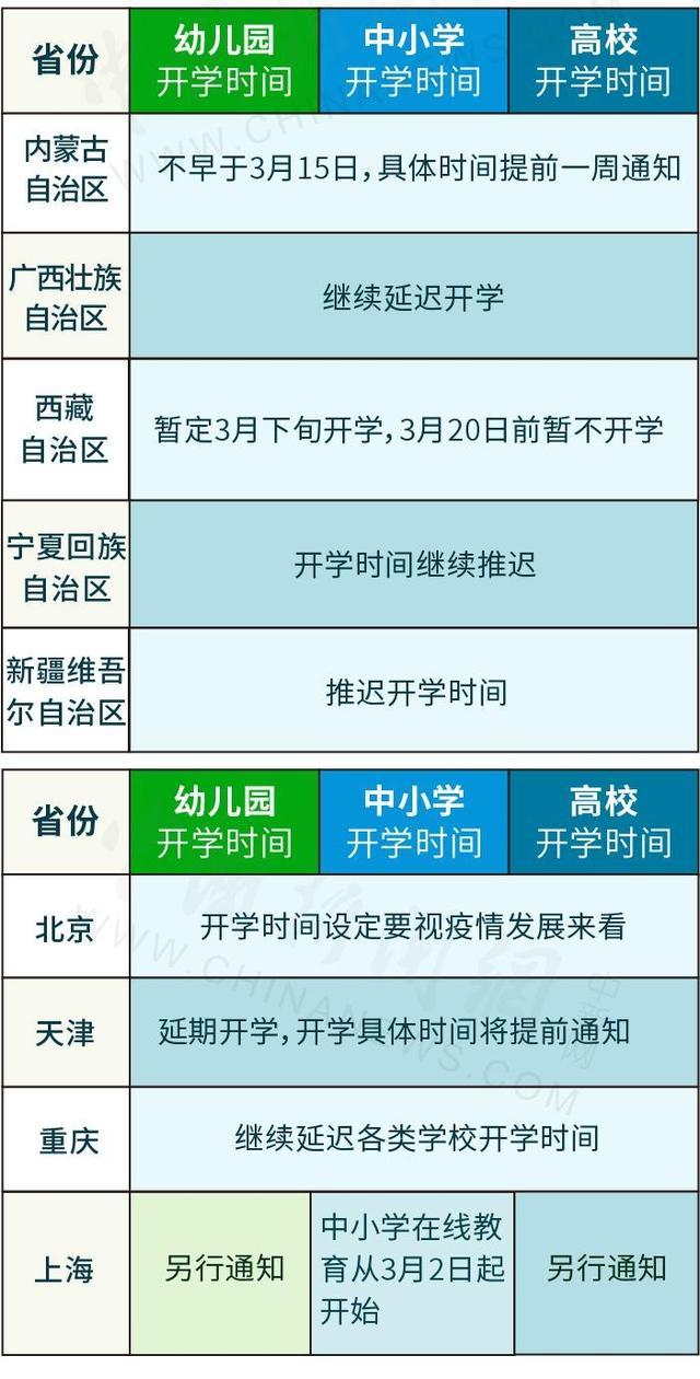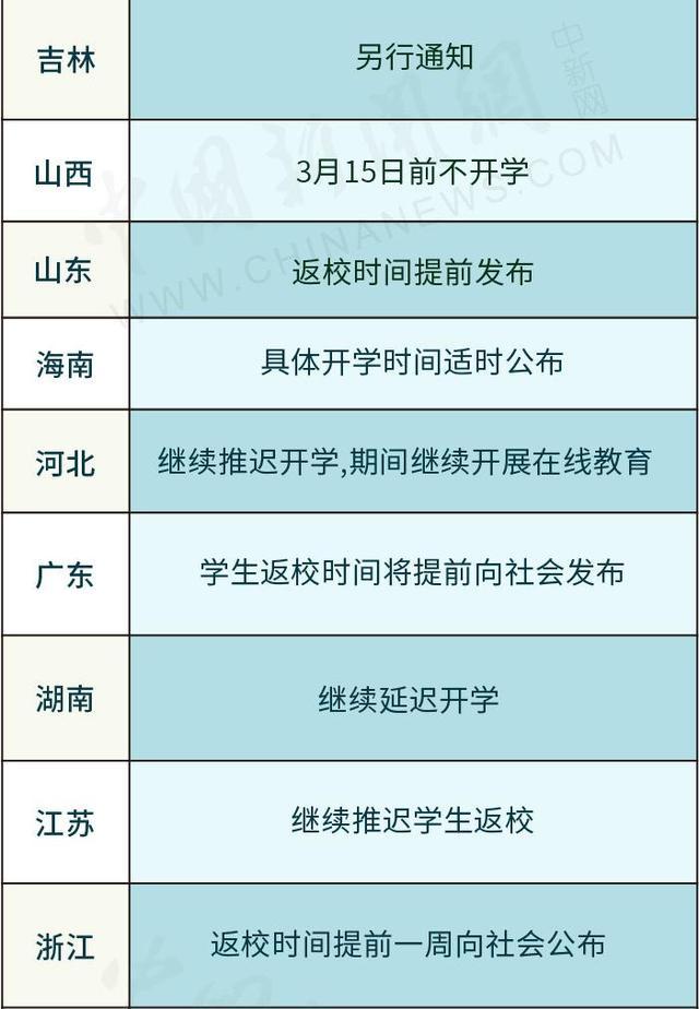 2020-03-10 12:52:07閱讀()中國新聞網(wǎng)一圖看明白!31省份開學(xué)時間一覽表,隨著疫情往好的方向發(fā)展,截止2020年3月10日已經(jīng)有幾個省、自治區(qū)相繼清零,各中小學(xué)高校也開始做好開學(xué)準(zhǔn)備,下圖來自中國新聞網(wǎng)匯總的“31省份開學(xué)時間一覽表”