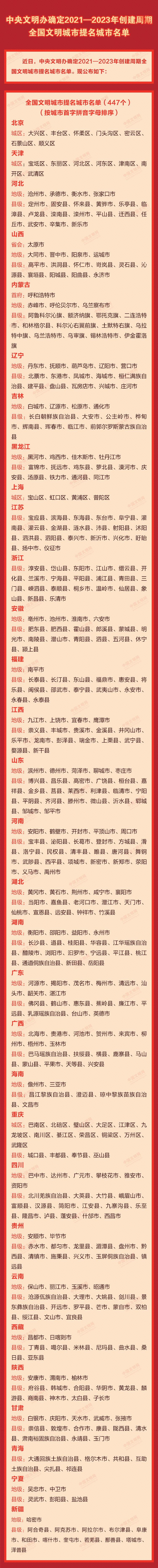 2021-2023年全國(guó)文明城市最新提名城市名單