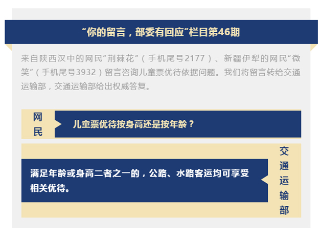 2021-02-03 00:15:08閱讀()交通運(yùn)輸部【交通運(yùn)輸部:滿足年齡或身高二者之一可享兒童票】“兒童票優(yōu)待按身高還是按年齡”?交通運(yùn)輸部回應(yīng):根據(jù)規(guī)定,對(duì)符合條件的兒童提供免費(fèi)乘坐客運(yùn)班車(國(guó)內(nèi)水路客運(yùn)船舶)或者客票半價(jià)優(yōu)待(9座及以下客車除外),免票兒童的范圍為6周歲(含)以下或者身高1.2米(含)以下;客票半價(jià)優(yōu)待兒童的范圍為6—14周歲或者身高1.2—1.5米。滿足年齡或身高二者之一的,均可享受相關(guān)優(yōu)待。
