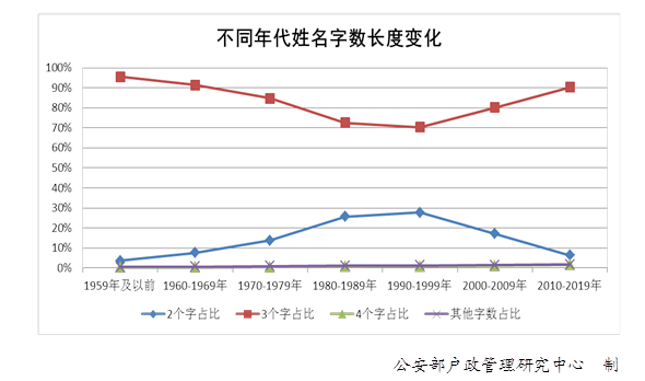 目前,我國(guó)除部分少數(shù)民族外,大部分人的名字多為二字(單姓單名)、三字(單姓雙名或復(fù)姓單名)或四字(復(fù)姓雙名),超出四字的比較少見。從不同年代看,三字姓名一直占據(jù)主流。特別是上世紀(jì)六十年代以前,宗族、家族姓名文化深入人心,取名字往往帶上標(biāo)識(shí)輩分的字,因此二字姓名較少。改革開放后,現(xiàn)代文化思潮不斷影響著取名字的方式,輩分觀念逐漸被淡化,人們?nèi)∶非蠛?jiǎn)潔好記,二字姓名人數(shù)占比由上世紀(jì)六十年代的7.6%增長(zhǎng)到九十年代的27.6%。21世紀(jì)以來(lái),隨著人口規(guī)模快速增長(zhǎng)和人口流動(dòng)日益頻繁,重名現(xiàn)象多了起來(lái),為了降低重名率,三字姓名又逐漸增多,目前,三字姓名占比超過(guò)90%,二字姓名占比減至6.3%。四字及其他字?jǐn)?shù)姓名雖使用人數(shù)較少,但一直保持增長(zhǎng)態(tài)勢(shì),分別由上世紀(jì)五十年代的0.3%、0.4%提高到目前的1.6%和1.7%。