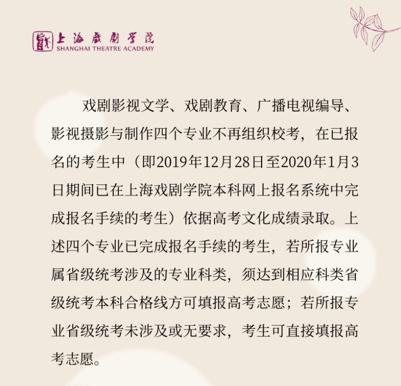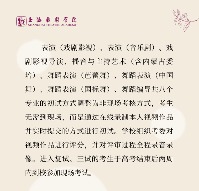 (節(jié)選自:上海戲劇學(xué)院2020年本科招生專業(yè)考試調(diào)整方案)