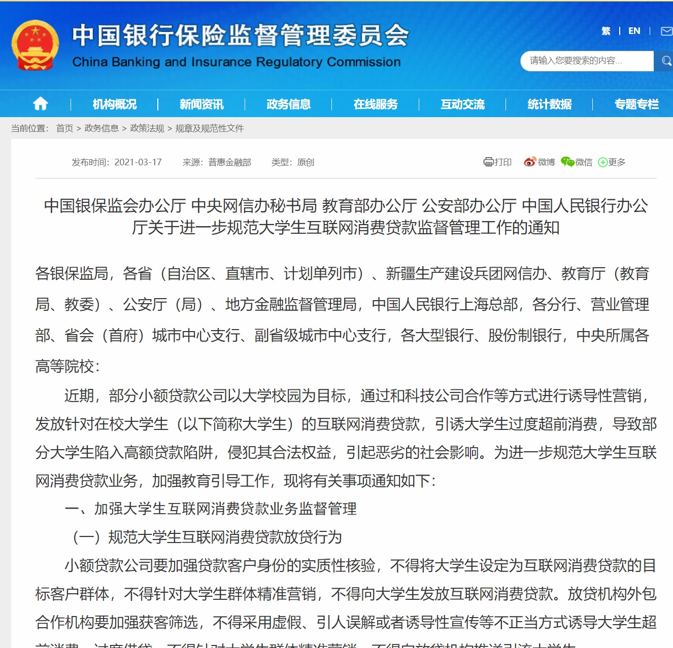 3月17日,銀保監(jiān)會官網(wǎng)發(fā)布《關(guān)于進一步規(guī)范大學(xué)生互聯(lián)網(wǎng)消費貸款監(jiān)督管理工作的通知》(下稱《通知》)。該《通知》由銀保監(jiān)會辦公廳、中央網(wǎng)信辦秘書局、教育部辦公廳、公安部辦公廳、人民銀行辦公廳于近日聯(lián)合印發(fā)。