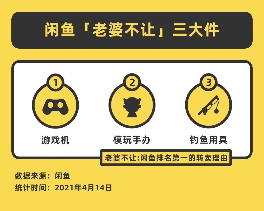 2021-04-14 16:39:58閱讀()閑魚4月14日消息4月14日,閑魚公布十大轉(zhuǎn)賣理由。從2018年到現(xiàn)在,“老婆不讓”始終高居榜首。比如“老婆不讓釣魚,再釣老婆就帶著孩子回娘家,魚竿半價處理”“昨天剛買的Switch國行版游戲機,老婆不讓玩,原價出”……