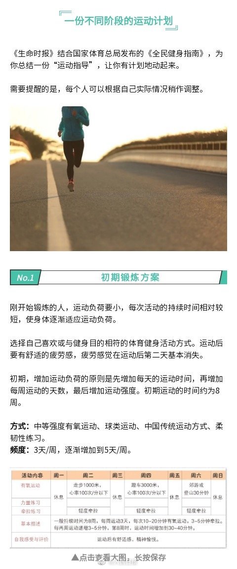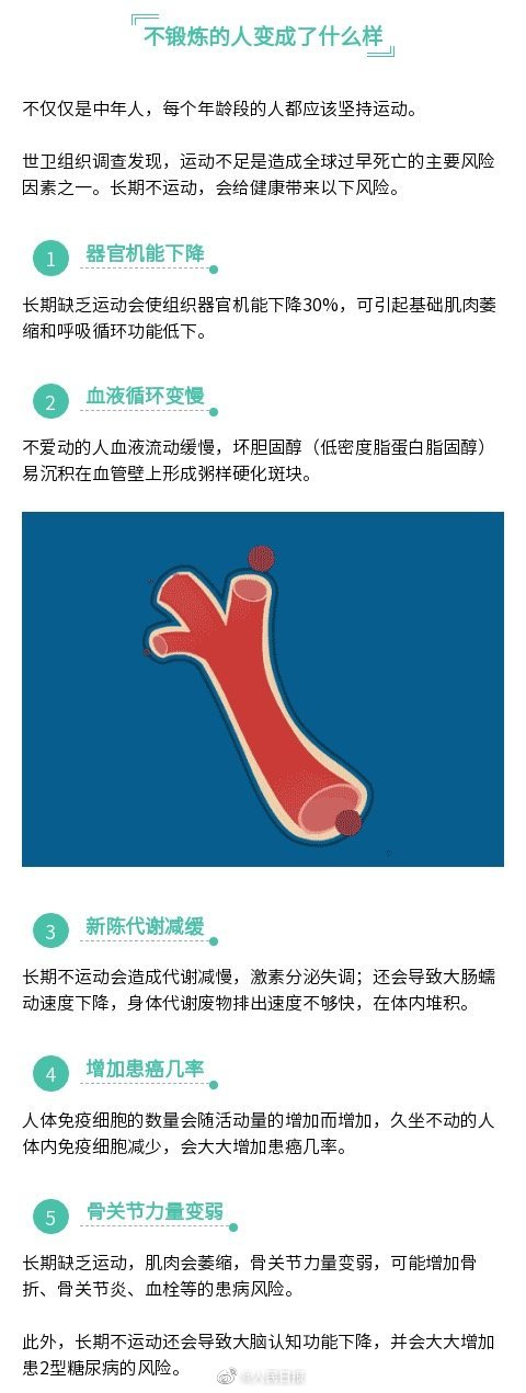 世衛(wèi)組織調(diào)查發(fā)現(xiàn),運(yùn)動(dòng)不足是造成全球過早死亡的主要風(fēng)險(xiǎn)因素之一。長期不運(yùn)動(dòng),會(huì)給健康帶來這些風(fēng)險(xiǎn):器官機(jī)能下降、血液循環(huán)變慢、新陳代謝變慢……結(jié)合國家體育總局發(fā)布的《全民健身指南》,為你總結(jié)一份“運(yùn)動(dòng)指導(dǎo)”,讓你有計(jì)劃地動(dòng)起來。