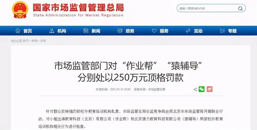 5月10日,國家市場監(jiān)督管理總局發(fā)布通告,稱作業(yè)幫及猿輔導(dǎo)存在虛假宣傳及誘騙消費(fèi)者交易等行為,被北京市市場監(jiān)管局處以警告和250萬元罰款的行政處罰。