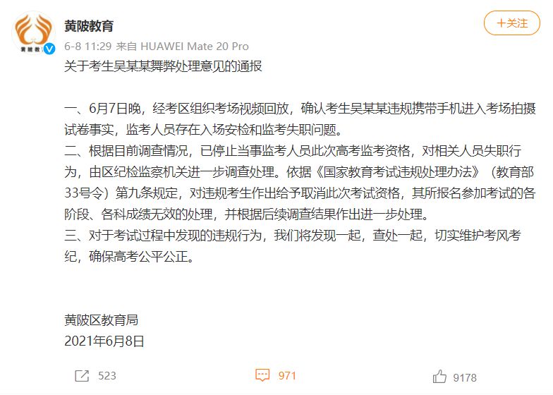 一、6月7日晚,經(jīng)考區(qū)組織考場視頻回放,確認(rèn)考生吳某某違規(guī)攜帶手機(jī)進(jìn)入考場拍攝試卷事實(shí),監(jiān)考人員存在入場安檢和監(jiān)考失職問題。