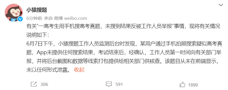 剛剛,小猿搜題官方也發(fā)布公告,對有關(guān)“一高考生用手機(jī)搜高考真題,未搜到結(jié)果反被工作人員舉報(bào)”事情,現(xiàn)將有關(guān)情況說明如下: