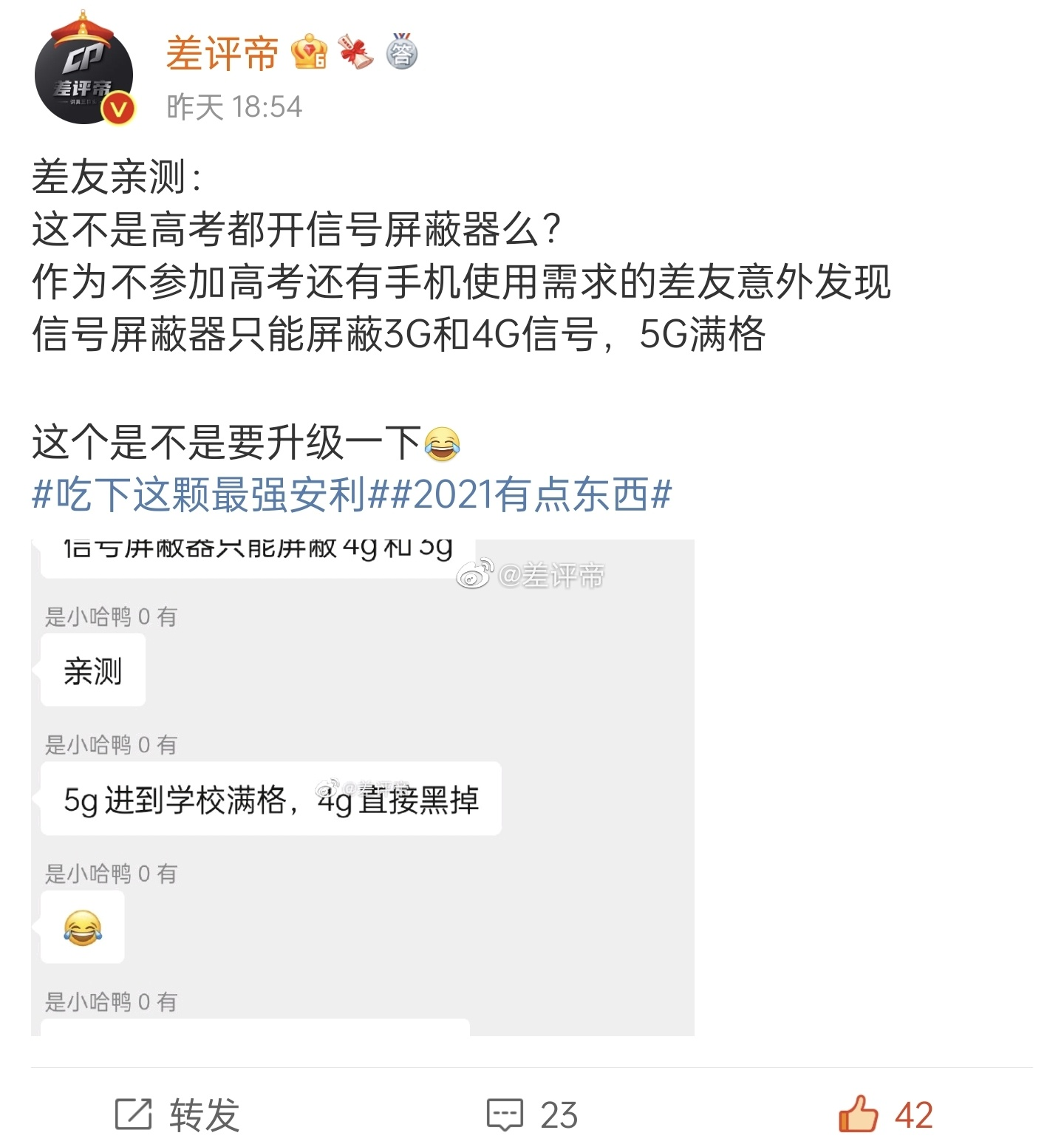 值得一提的是,有網(wǎng)友意外發(fā)現(xiàn)高考考場(chǎng)信號(hào)屏蔽器只能屏蔽3G和4G信號(hào),5G信號(hào)滿(mǎn)格。