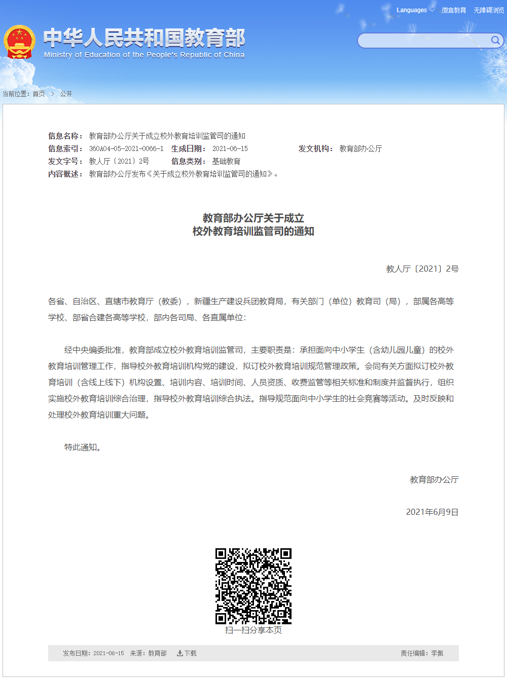 2021-06-15 22:19:26閱讀()教育部教育部辦公廳關于成立校外教育培訓監(jiān)管司的通知