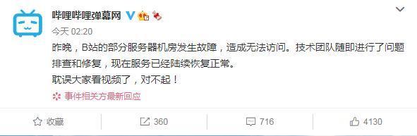 今天凌晨(7月14日)2點,嗶哩嗶哩彈幕官微更新動態(tài)稱“昨晚,B站的部分服務(wù)器機房發(fā)生故障,造成無法訪問。技術(shù)團隊隨即進行了問題排查和修復,現(xiàn)在服務(wù)已經(jīng)陸續(xù)恢復正常。”