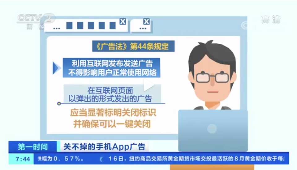 其中《廣告法》第44條規(guī)定,利用互聯(lián)網(wǎng)發(fā)送廣告,不得影響用戶正常使用網(wǎng)絡(luò)。在互聯(lián)網(wǎng)頁面以彈出的形式發(fā)出的廣告,應(yīng)當(dāng)顯著標(biāo)明關(guān)閉標(biāo)識(shí),并確保可以一鍵關(guān)閉。