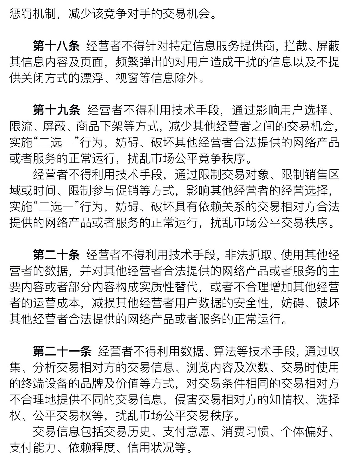 經(jīng)營(yíng)者不得利用數(shù)據(jù)、算法等技術(shù)手段,通過(guò)收集、分析交易相對(duì)方的交易信息、瀏覽內(nèi)容及次數(shù)、交易時(shí)使用的終端設(shè)備的品牌及價(jià)值等方式,對(duì)交易條件相同的交易相對(duì)方不合理地提供不同的交易信息,侵害交易相對(duì)方的知情權(quán)、選擇權(quán)、公平交易權(quán)等,擾亂市場(chǎng)公平交易秩序。(交易信息包括交易歷史、支付意愿、消費(fèi)習(xí)慣、個(gè)體偏好、支付能力、依賴程度、信用狀況等)