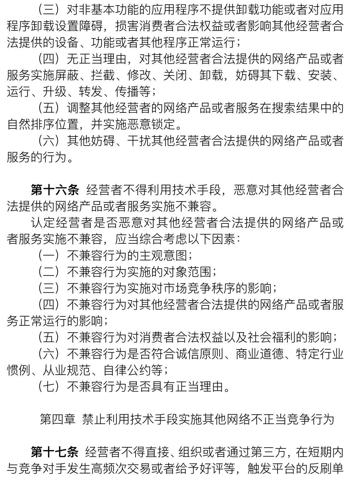 《規(guī)定》中提出,經(jīng)營(yíng)者不得利用數(shù)據(jù)、算法等技術(shù)手段,通過(guò)影響用戶選擇或者其他方式,實(shí)施流量劫持、干擾、惡意不兼容等行為,妨礙、破壞其他經(jīng)營(yíng)者合法提供的網(wǎng)絡(luò)產(chǎn)品或者服務(wù)正常運(yùn)行。
