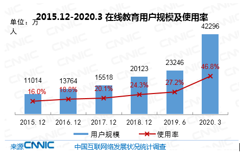截至2020年3月,我國在線教育用戶規(guī)模達(dá)4.23億,較2018年底增長2.22億,占網(wǎng)民整體的46.8%;手機(jī)在線教育用戶規(guī)模達(dá)4.20億,較2018年底增長2.26億,占手機(jī)網(wǎng)民的46.9%。受衛(wèi)生事件影響,全國大中小學(xué)開學(xué)推遲,教學(xué)活動(dòng)改至線上,推動(dòng)在線教育用戶規(guī)??焖僭鲩L。