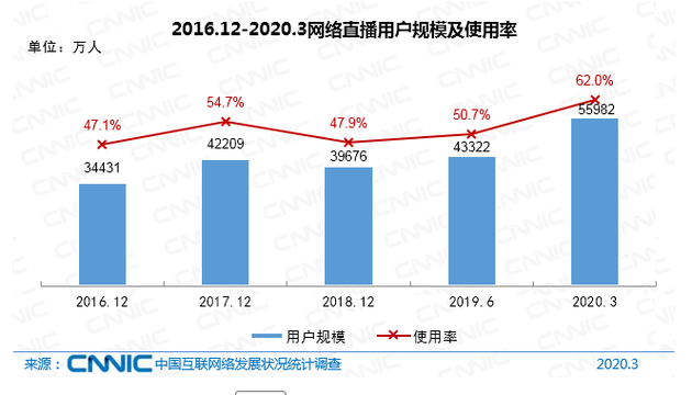 電商直播蓬勃發(fā)展,管理機(jī)制進(jìn)一步完善截至2020年3月,我國網(wǎng)絡(luò)直播用戶規(guī)模達(dá)5.60億,較2018年底增長1.63億,占網(wǎng)民整體的62.0%。其中,游戲直播的用戶規(guī)模為2.60億,較2018年底增長2204萬,占網(wǎng)民整體的28.7%;真人秀直播的用戶規(guī)模為2.07億,較2018年底增長4374萬,占網(wǎng)民整體的22.9%;演唱會(huì)直播的用戶規(guī)模為1.50億,較2018年底增長4137萬,占網(wǎng)民整體的16.6%;體育直播的用戶規(guī)模為2.13億,較2018年底增長3677萬,占網(wǎng)民整體的23.5%。在2019年興起并實(shí)現(xiàn)快速發(fā)展的電商直播用戶規(guī)模為2.65億,占網(wǎng)民整體的29.3%。