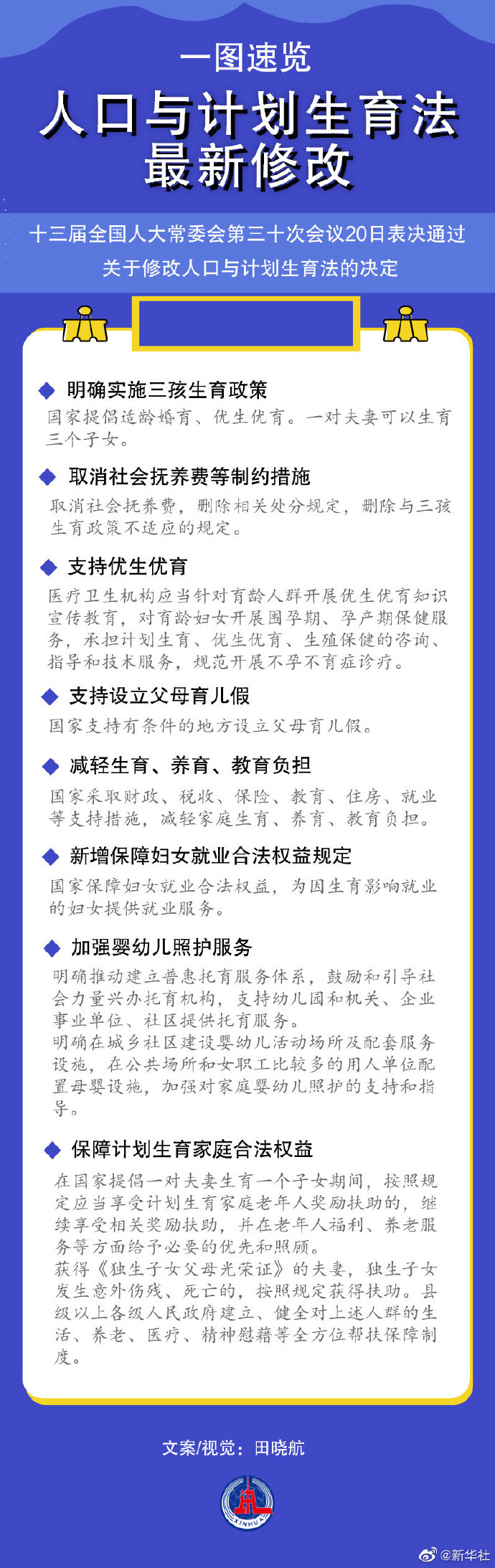 全國人大常委會會議20日表決通過了關(guān)于修改人口與計劃生育法的決定。修改后的人口計生法規(guī)定,國家提倡適齡婚育、優(yōu)生優(yōu)育,一對夫妻可以生育三個子女。國家采取財政、稅收、保險、教育、住房、就業(yè)等支持措施,減輕家庭生育、養(yǎng)育、教育負擔(dān)。