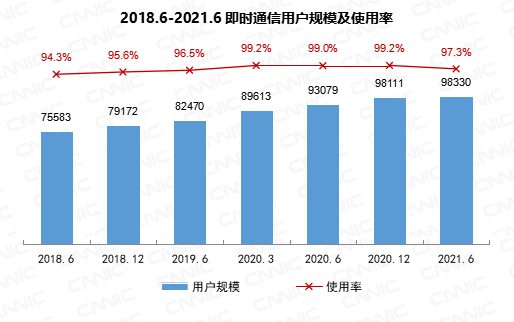 截至2021年6月,我國即時通信用戶規(guī)模達9.83億,較2020年12月增長218萬,占網(wǎng)民整體的97.3%。