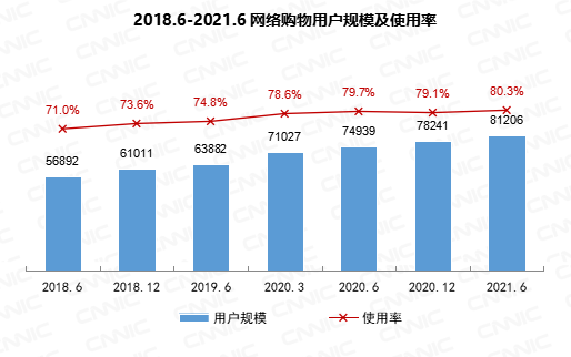 截至2021年6月,我國網(wǎng)絡購物用戶規(guī)模達8.12億,較2020年12月增長2965萬,占網(wǎng)民整體的80.3%。