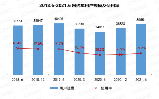 截至2021年6月,我國網(wǎng)約車用戶規(guī)模達3.97億,較2020年12月增長3123萬,占網(wǎng)民整體的39.2%。