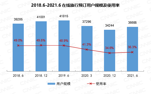 截至2021年6月,我國在線旅行預訂用戶規(guī)模達3.67億,較2020年12月增長2411萬,占網(wǎng)民整體的36.3%。