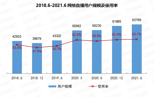 截至2021年6月,我國網(wǎng)絡直播用戶規(guī)模達6.38億,同比增長7539萬,占網(wǎng)民整體的63.1%。其中,電商直播用戶規(guī)模為3.84億,同比增長7524萬,占網(wǎng)民整體的38.0%。