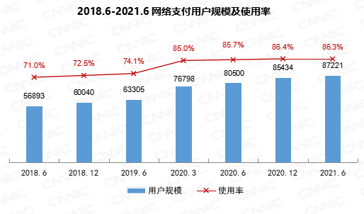 截至2021年6月,我國網(wǎng)絡支付用戶規(guī)模達8.72億,較2020年12月增長1787萬,占網(wǎng)民整體的86.3%。