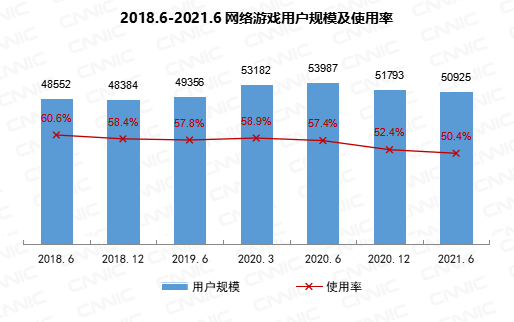 截至2021年6月,我國網(wǎng)絡游戲用戶規(guī)模達5.09億,較2020年12月減少869萬,占網(wǎng)民整體的50.4%。