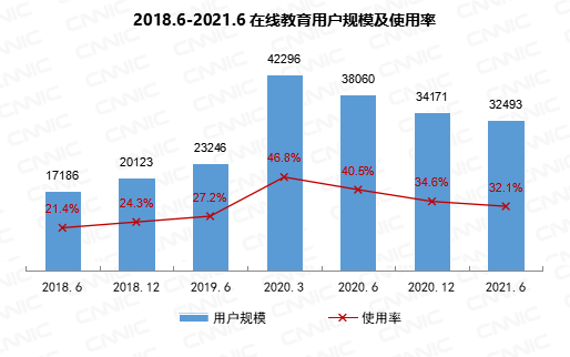 截至2021年6月,我國在線教育用戶規(guī)模達3.25億,較2020年12月減少1678萬,占網(wǎng)民整體的32.1%。