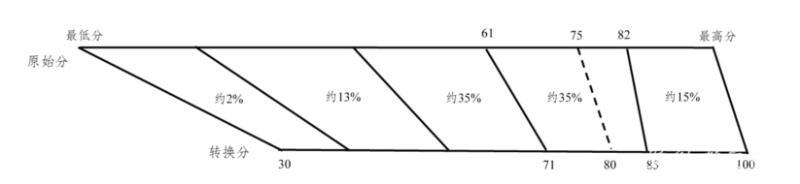 第二步,同一等級(jí)內(nèi),根據(jù)考生的原始分、所在等級(jí)的原始分區(qū)間和轉(zhuǎn)換分區(qū)間,按照分?jǐn)?shù)轉(zhuǎn)換公式,計(jì)算得到考生的轉(zhuǎn)換分。
