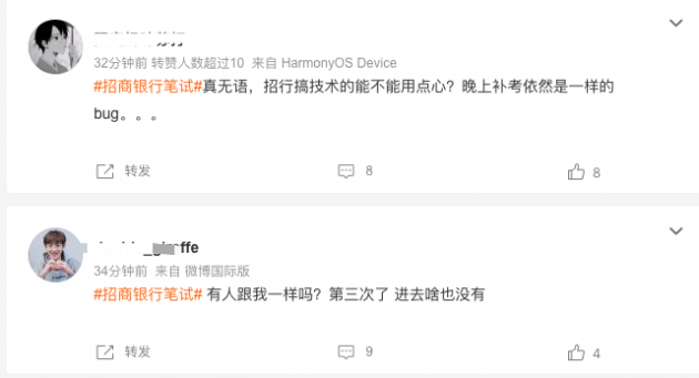 2021-10-17 20:52:54閱讀()互聯(lián)網(wǎng)10月17日消息,據(jù)多名網(wǎng)友在微博發(fā)文反映,在昨日招商銀行筆試過程中,考試系統(tǒng)多次崩潰,出現(xiàn)亂碼情況、重啟電腦導(dǎo)致考試中斷,參加補考仍然出現(xiàn) bug 等等。